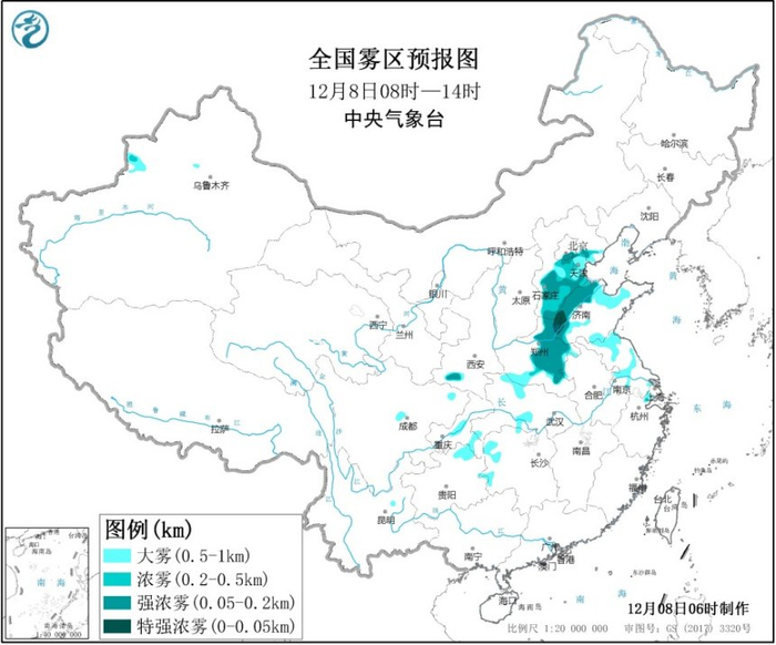 预计8日早晨至上午,河北中南部、北京东南部、天津、河南中东部、山东北部和西部、江苏北部和中部、四川盆地东部、贵州北部等地有大雾,其中,河北南部、北京东南部、河南中东部、山东西北部等地的部分地区有能见度不足200米的强浓雾,局地有能见度不足50米的特强浓雾。