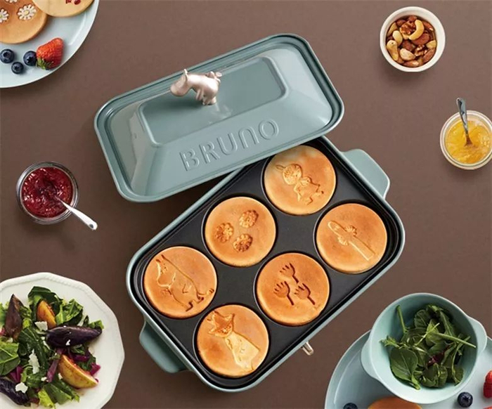 在日本非常受欢迎且拥有超高颜值的家居品牌BRUNO将姆明带上餐桌,联名定制了姆明限量版的多功能料理锅和轻食机。这款多功能料理锅是BRUNO的明星单品,作为厨房里的颜值代表,单是复古洋气的外观,就足以吸引万千女生的心。别看它身材只有A4纸大小,却可以搭配五种烤盘,煎、烤、煮、蒸、烙等样样全能。BRUNO轻食机操作也非常简单,把食材放进去,合上盖子,加热,三步傻瓜式操作简单得无需过脑,让你轻松享受美味早餐。