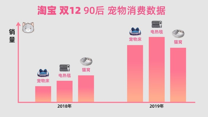 与此同时,90后也越来越“把宠物当娃养”,购买各种宠物用品改善宠物生活。近期全国降温,90后给自己买保暖用品的同时,也不忘给宠物安置一个“保暖房”。淘宝“双12”的宠物床、宠物电热毯等商品销量同比大涨,其中狗窝电热毯销售火爆,数据显示,淘宝今年狗窝电热毯的销量同比去年增长了一倍。