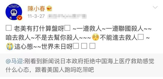 当时,陈小春经纪人看到新闻说日本政府拒绝了中国海上医疗救助,发微博吐槽:“不知道日本人什么心态”,陈小春马上转发评论道:“咱去救人,不是去帮你杀人……这心态,世界末日呀!”↓↓