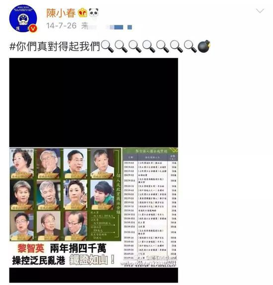 而这并非陈小春唯一一次对“占中”事件表态。同年7月26日,他在微博上传一张写有“黎智英两年捐四千万,操控泛民乱港铁证如山”字样的图片,称“你们真对得起我们”。