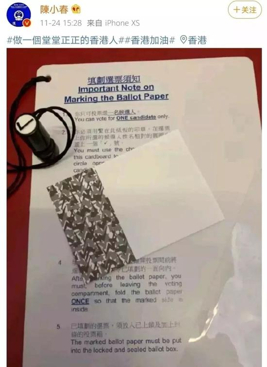 11月,香港区议会选举举行,陈小春在微博上传了一张带有选票和投票印章的照片,还加上了“做一个堂堂正正的香港”“香港加油”的话题。