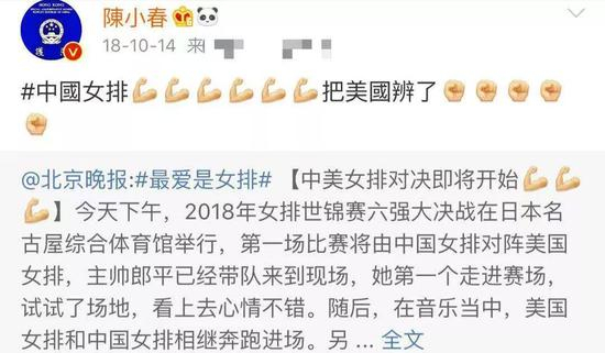 而且这还不是个例。去年女排世锦赛,中美对决时,他发微博让中国女排把美国“办了”,这画风真的很“山鸡哥”了↓↓