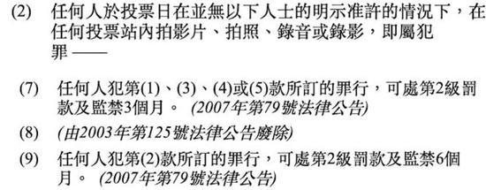 原来根据香港选举的相关条例,投票日当天,任何人不得在任何投票站内拍影片、拍照、录音或录影,违者视为犯罪,最高可判处罚款5千港币及监禁6个月。