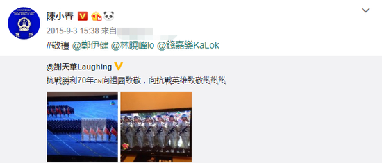 2015年9·3阅兵,同样出演过“古惑仔”的谢天华发了向祖国致敬的微博,陈小春不仅火速转发,还不忘@其他“古惑仔”兄弟,简直隔着屏幕都能感觉到春哥内心的自豪啊↓↓