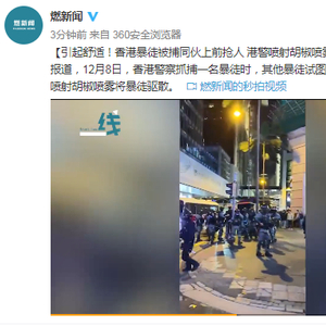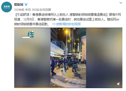 据海外网报道,12月8日,香港警察抓捕一名暴徒时,其他暴徒试图上前抢人。随后阿sir喷射胡椒喷雾将暴徒驱散。