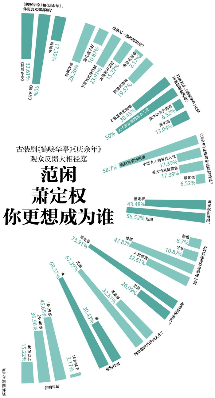 这两部剧有相似的背景,却又是完全不同的风格,观众更喜欢哪一种?接受新京报问卷调查的观众里,《庆余年》的拥趸比《鹤唳华亭》更多;他们因为范闲现代人的性格而喜欢他,也因为萧定权的虐心人生而同情他。这届观众也更喜欢轻松搞笑的内容,对于苦情戏有本能的排斥。