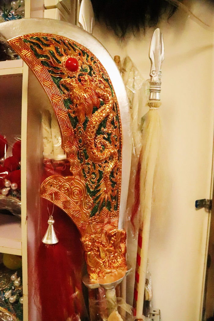许振海看着面前的盔头与把子感慨不已:“你看,《杨门女将》中佘太君佩戴的是老旦帅盔,老旦帅盔需要挂上穗子,而老旦凤盔不能挂穗子;王朝、马汉挎腰刀要挎绿色的,韩琦要挎黑色的。”