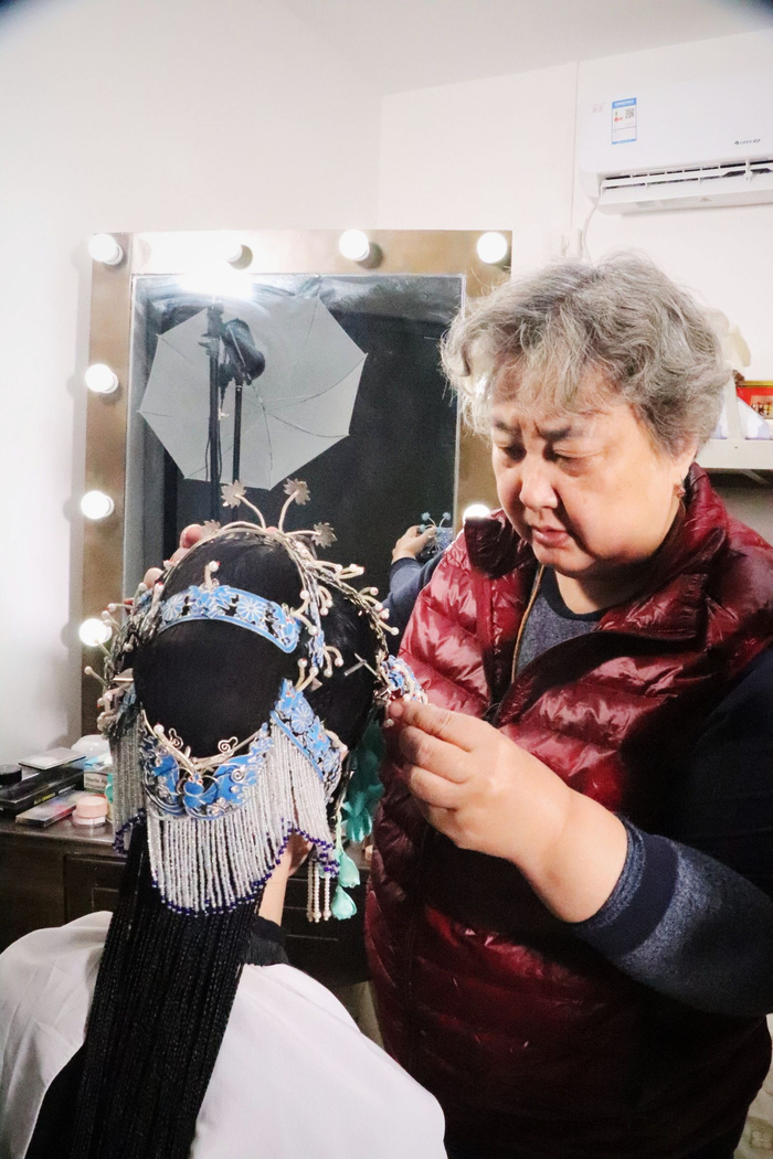 佟群雁是北京戏曲艺术职业学院的舞美戎装老师,19岁入学,21岁从业,如今已经60岁了,她的工作主要分画面部油彩和“贴片子”、佩戴头饰两部分。