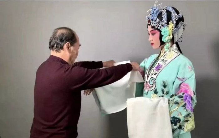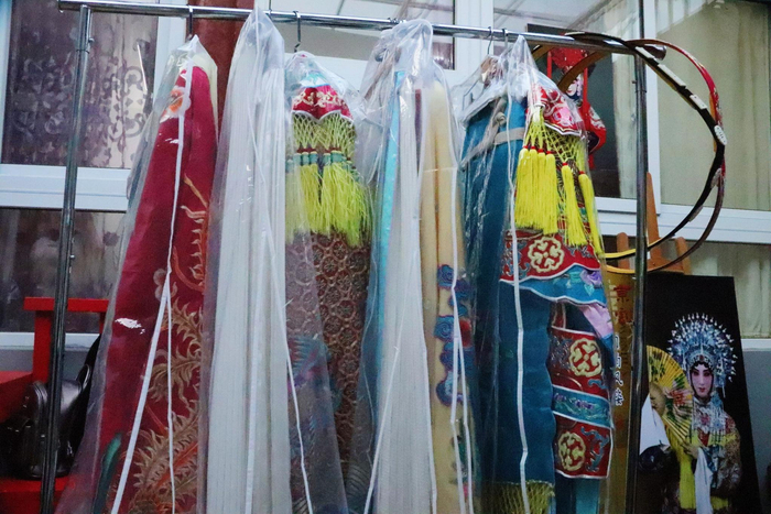 上了妆,自然要换上戏服,舞美服装老师张英俊正在准备一套“杜丽娘”的服饰。戏曲服装分大衣箱、二衣箱、三衣箱,张英俊主要负责大、二衣箱,启箱以及为演员配上相应扮相。