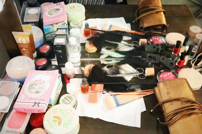 “东厢房”是化妆间与拍照地,化妆沿用“油彩上色、粉彩定妆”的传统画法。不过,还不忙上妆,且去“西厢房”看看“贴片子”前鬓发的准备工序。
