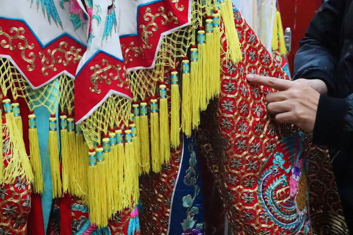 挂在衣架上的京剧服饰,或明艳或淡雅,其中数《贵妃醉酒》的灯笼锦“女蟒”最亮眼,5位工人共同绣制5个月,上面的盘金“格子”似灯笼。