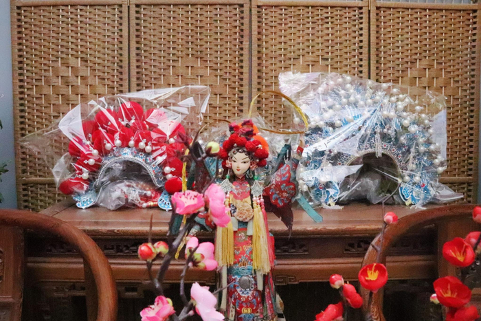 他工作室的四合院不大,约60平方米左右,厅堂按照八仙桌、太师椅、条案的陈设布局,穆桂英佩戴的“七星额子”、皇后贵妃佩戴的“九只凤冠”陈列在案子上。旁边还有京剧舞台上的“一桌二椅”,仿佛京二胡与琴声一响起,一出戏就开场了。