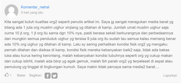 印尼网民撒坤说,希望有更多的学者发表这样生动的介绍新疆真实情况的文章,不要像一些媒体只报道负面的新闻。