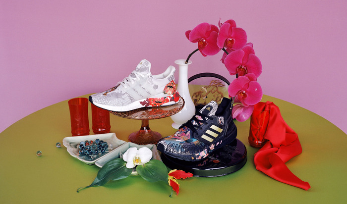 与去年的红白配色简洁风格相比,今年的CNY系列大量运用了海棠花、牡丹花、扶桑花、锦鲤、仙鹤这些中国古典元素,更有艺术感。官方的预览图片中,球鞋与瓷器、盆景等被放在一起展示,浓烈的中国风扑面而来。