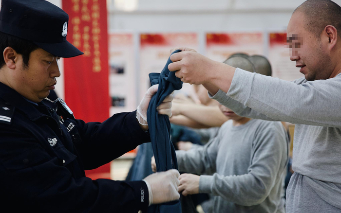 民警把犯人所穿的衣服鞋袜,包括可能藏有细小物品的耳朵、嘴巴,都挨个检查一遍,防止有夹带违禁物品。新京报记者 郑新洽 摄