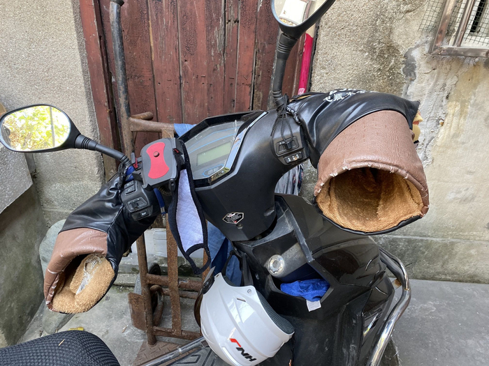 吴德宏的痕迹已经烙在车上。把手上包着的一双棉袖筒,袖口处磨得掉了毛。仪表盘旁边装着手机支架,下方挂着一副头盔和一个黑色棉布口罩。