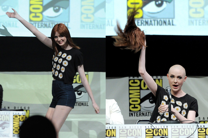 为在《银河护卫队》中饰演星云,凯伦·吉兰剃光了一头长发,并用镜头记录下了这特别的一幕。该片上映前,戴着假发参加圣迭戈漫展的她,现场展示自己的光头,成为那一年的名场面。