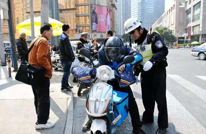险些被违法外卖非机动车撞倒的胡琴则希望,提升道路见警率和处罚力度:“延安路这样的主干道上,外卖、快递车违法比比皆是。如果交警现场管得严,这样的违法行为不会如此理直气壮。”曾因闯红灯被处罚的外卖骑手张光明一次送餐迟到,客户明确表示要投诉,情急之下闯了红灯:“当时看到路口没有警察就过去了。虽然一样是被处罚,交警现场罚我印象会更深。”他也建议企业有从业者申诉制度,确实因为商家出餐慢等外界因素造成的延迟不予处罚。