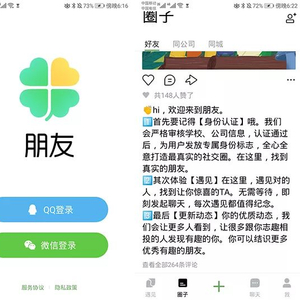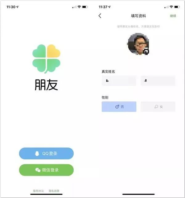 打开“朋友”App,可通过微信和QQ进行登录。填写基本资料时,会建议你使用真实姓名和头像,但并没有强制,非真实信息也能正常使用App。