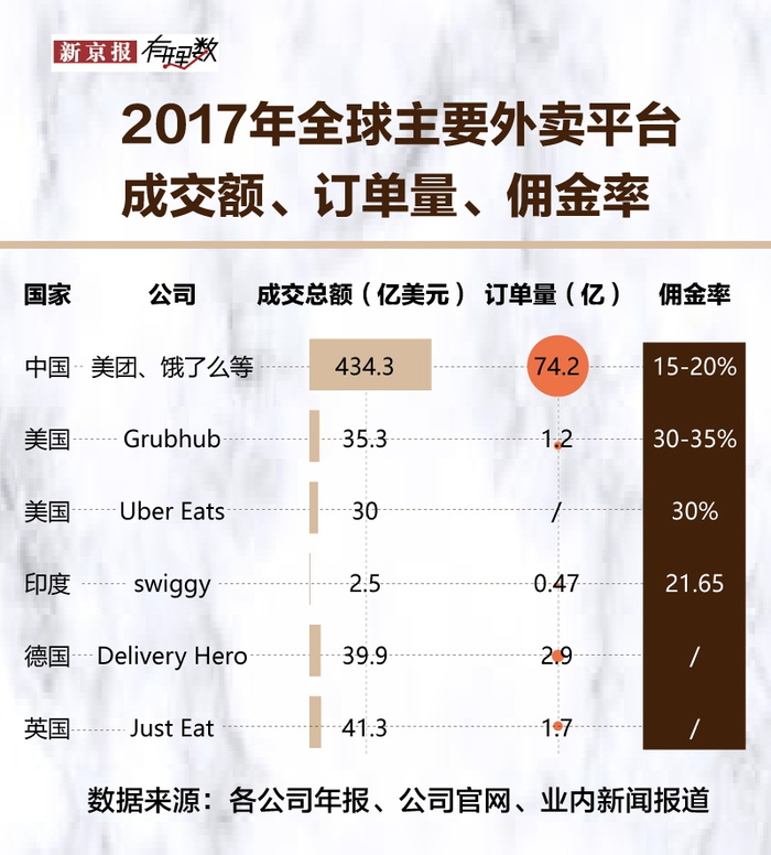 中国外卖员的佣金率低,但由于需求大、人口密度高,中国外卖员的业务量远超国外。