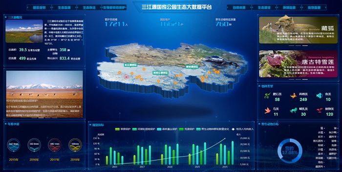 2017年至今,三江源国家公园生态大数据中心(一、二期)初步建立了国家公园云管理系统和具备云计算能力的大数据平台,完成了数据管理、传输管理和信息安全的基本软硬件建设。在平台建设的基础上,还形成了统一、规范、标准的三江源国家公园人类多动与生态系统基准数据,基本完成了15米分辨率和亚米级分辨率的基础地理信息基准建设及重点区域三维展示模块的建设;初步实现了园区各类数据的标准处理、整合统筹、动态接入、直观展示与可信决策,为园区生态保护、环境监测、监察执法、高效管理、科研宣教、社区发展等提供空间信息基准支撑。