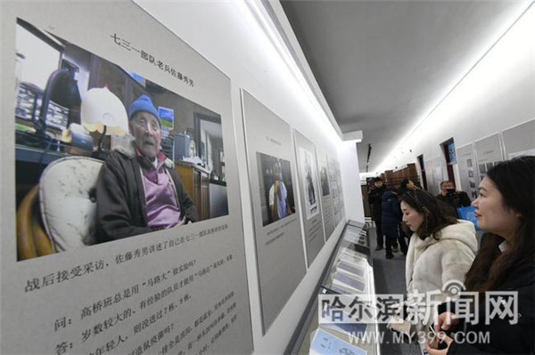 12月13日,“七三一部队新发现、未公开史料展”在七三一部队本部大楼旧址开展。由侵华日军第七三一部队罪证陈列馆赴日取证带回的日军第七三一部队原队员须永鬼久太的视频资料,在展览现场循环播放,与其共同首次公开的还有由78块展板、200余张资料照片及书刊组成的史料。在第六个南京大屠杀死难者国家公祭日这个特殊的日子,本次展览以还原历史的方式,提醒世人勿忘国耻、铭记历史、捍卫和平。