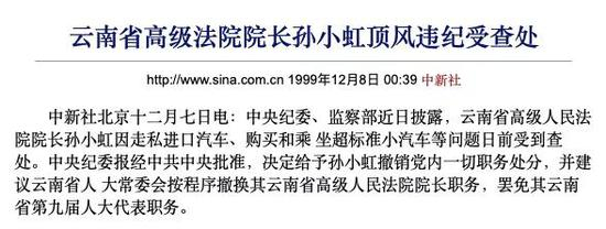 中央纪委报经中共中央批准,决定给予孙小虹撤销党内一切职务处分,并建议云南省人大常委会按程序撤换其云南省高院院长职务,罢免其云南省第九届人大代表职务。