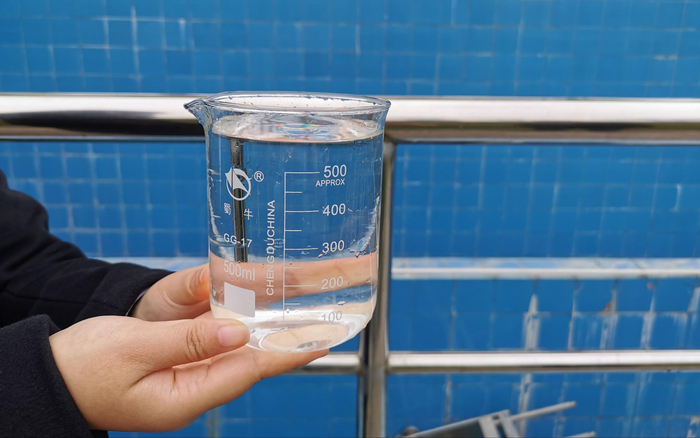 十堰市泗河流域下游污水处理厂内,工作人员用烧杯舀起一杯净化后的水,十分清澈干净。摄影/新京报记者 马瑾倩