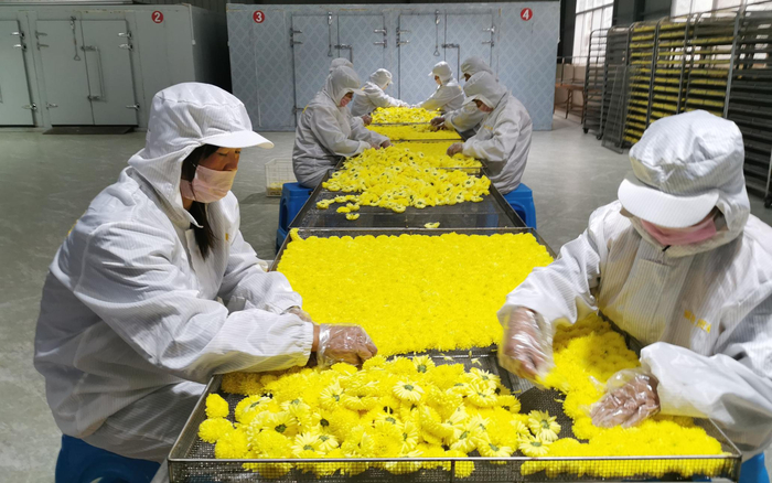 一朵菊花足够一泡。热水一冲,菊花在水杯中旋转,茶水满满泡出淡雅的黄色。2014年试种成功后,至今种植面积已达1300亩,并获得一项国家专利,带动当地500余户贫困户成功脱贫。