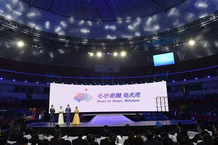 活动现场,杭州亚运会主题口号正式公布:心心相融,@未来
