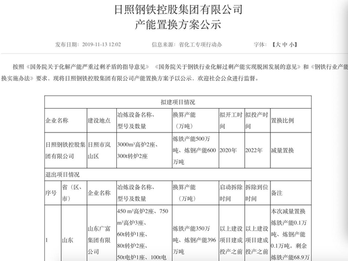 在日照钢铁集团上述项目建成之前,作为减量置换,淄博齐林傅山钢铁有限公司会拆除高炉,换算产能为炼铁产能73万吨、炼钢产能60万吨,山东隆盛钢铁有限公司会拆除高炉,换算产能为炼铁产能151.25万吨、炼钢产能180万吨。