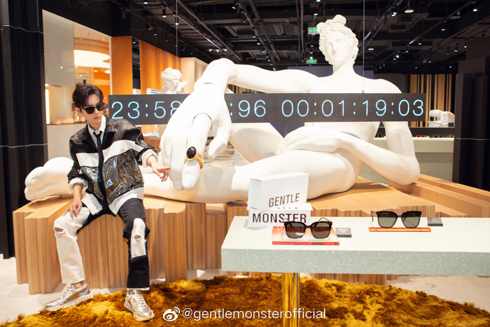 △肖战来店内打卡时,戴着GM墨镜和这个装置合了影,潮范十足。图/GENTLE MONSTER官方微博截图