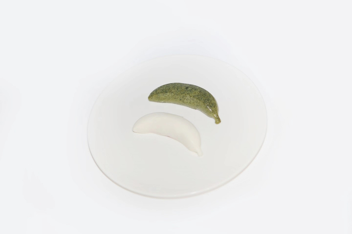 由椰子布丁制成的“未来人类”系列的“耳朵”,外面是椰子布丁,里面包裹着的夹心是抹茶巧克力和南瓜红丝绒蛋糕,口感层次丰富。两个颜色各异的“香蕉”则分别由抹茶奶冻和椰子奶冻制成,吃一口椰子味的“香蕉”,再吃一口抹茶味的,两种奇妙的口感,交相融合,让人过口难忘。