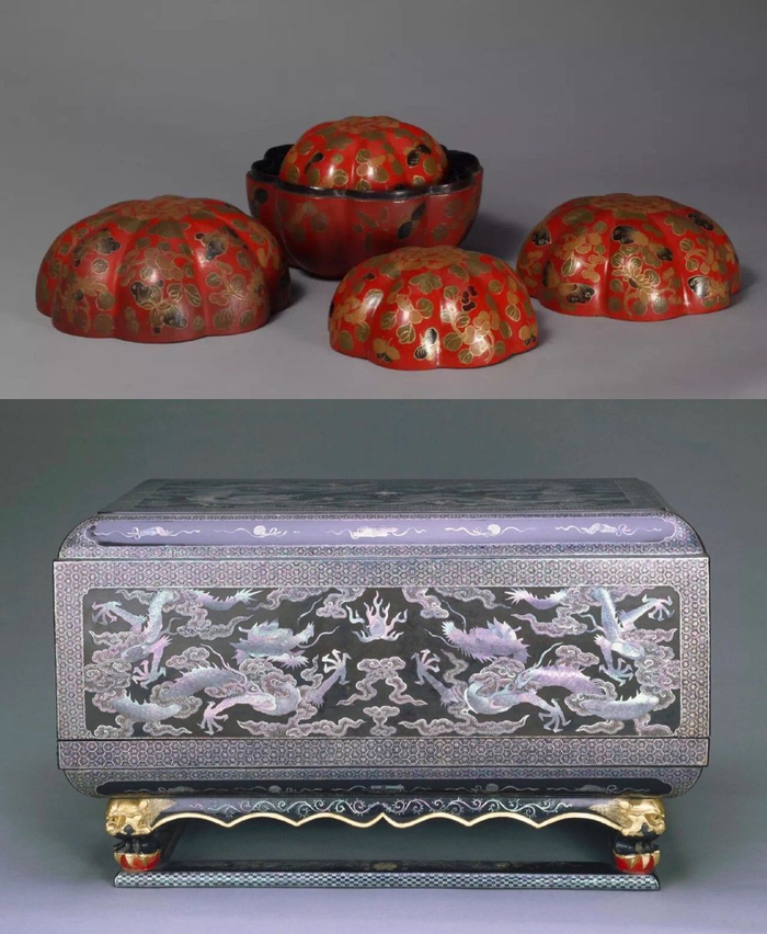 漆器是最古老的手工艺制品,中国出土最早的木质漆碗,早在七千多年前的河姆渡时期。从早期描绘到后期以工具剔刻,再发展出雕填、镶嵌、戗金、点螺等工艺,漆器一直为人们所喜爱。清代漆器制作达到了巅峰,这次特展的展品如春天里绽放的花朵般绚丽,看点十足。