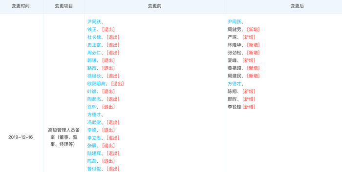 天眼查平台显示,在高级管理人员备案(董事、监事、经理等)一栏中,变更前共有31位高管,变更后杜长棣、史正富、周必仁等29位高管退出,原有高管尹同跃、方德留任,同时新增周健男、 严琛、林隆华、 张劲松、 夏峰、 黄祖超、 周建民、 陈翔、 邢晖、 李锐锋10位高管。变更后共有12位高管在列。