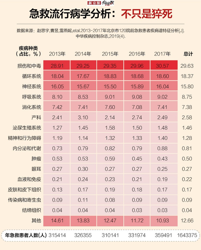 北京大学公共卫生学院流行病与卫生统计学系的赵思宇等人利用北京急救中心120调度指挥系统2013-2017年的院前急救出车数据,分析了北京市164.3万院前急救患者的疾病谱特征。