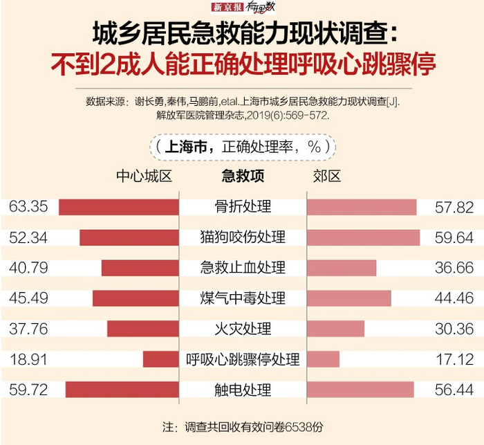 今年发表的一项针对上海市居民急救能力现状的调查显示,居民紧急情况下急救正确处理率为 44.27%。其中紧急进行心肺复苏的正确处理率最低,仅为18%。