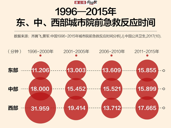 齐腾飞等人收集了1996年1月—2015年9月以“院前急救”和“时间”为关键词的369篇文献454条数据,覆盖中国188个东、中、西部城市,通过meta分析(一种用来收集和整合有关一个研究问题的所有相关研究证据的科学方法)比较中国院前急救水平,各地区城市急救反应时间平均在15分钟以上。