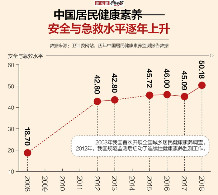 2008年原卫生部首次发布《中国公民健康素养—基本知识与技能(试行)》,抽取全国31个省7万余人,进行健康素养现状调查,当年全国居民健康素养中的安全与急救素养水平18.70%。安全与急救素养水平指具备基本安全与急救素养的人在总人群中所占的比例。