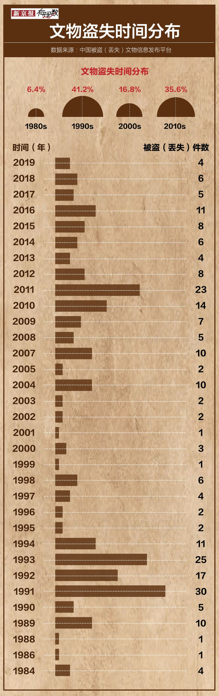 在被盗(丢失)文物信息发布平台显示,90年代盗失文物的数量最多,占比41.2%。