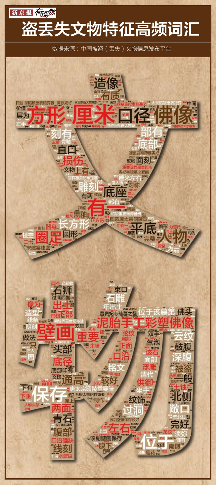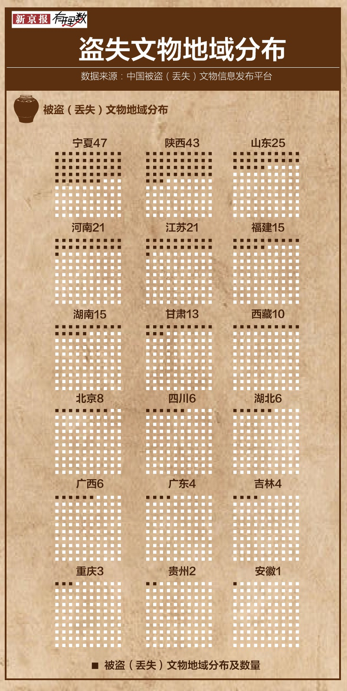 通过抓取分析中国被盗(丢失)文物信息发布平台上关于流失文物的地域信息发现,宁夏、陕西、山东、河南四省被盗文物数量高居前四。