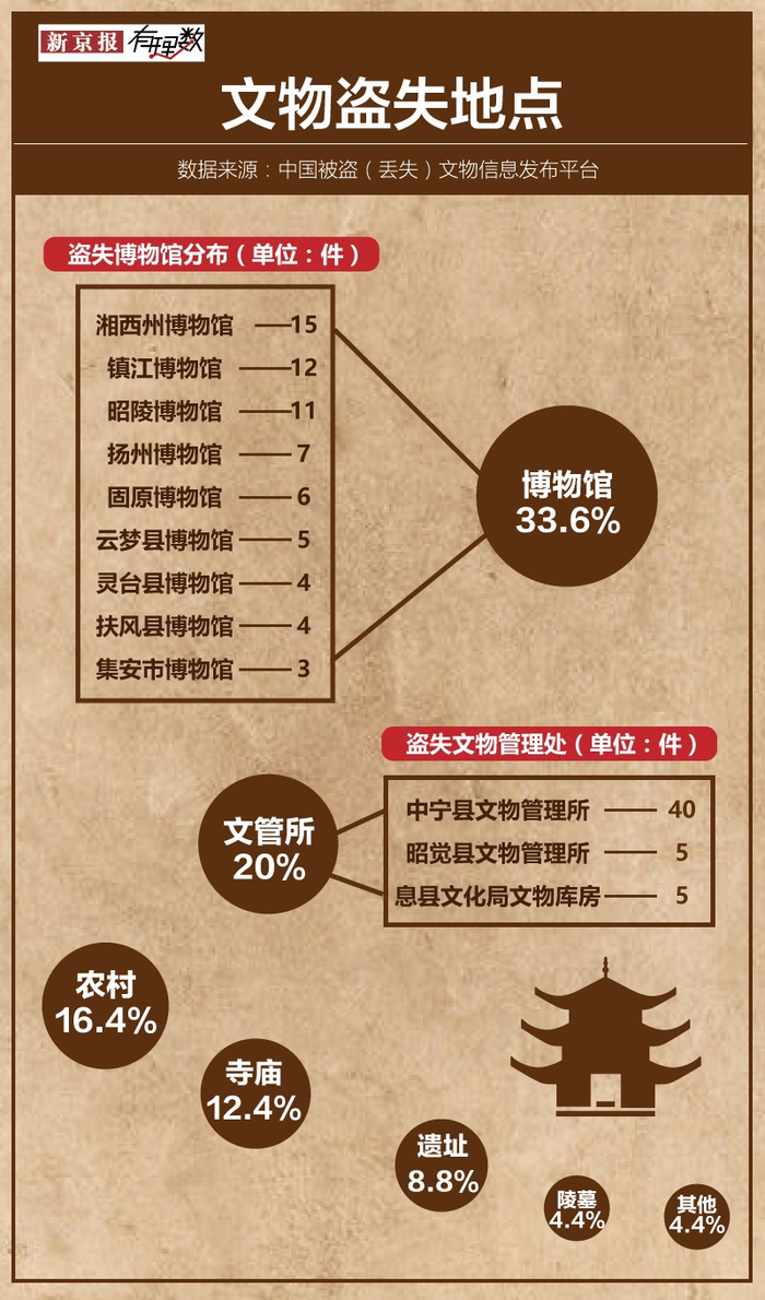 文物管理所是文物丢失的主要地方。在宁夏被盗的47件文物中,有40件发生在中宁县文物管理所,1件发生在固原市原州区须弥山文物管理所。除此,还有河南息县文化局文物库房被盗5件文物。