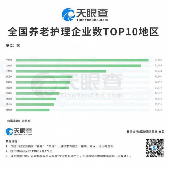 天眼查数据显示,近年来,我国养老护理类企业数上升明显。截至2019年12月17日,养老护理类企业数已突破42万家。广东省、山东省、江苏省、浙江省、安徽省的养老护理企业注册数量均超过2万家。