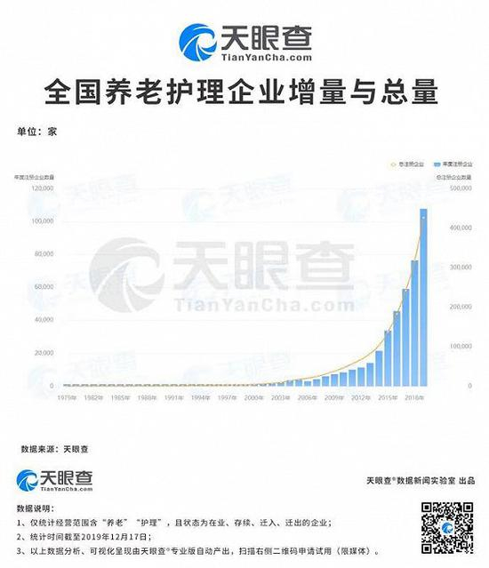 2013年被认为是标志性的中国养老产业元年。天眼查数据显示,2013年以来,我国养老护理类企业数的增幅稳步加大。2014年,养老服务企业数量超过20000家,2016年,养老护理企业数量超过40000家。截至目前,2019年,新增企业数便超过10万家,是五年前的10倍,十年前的14倍。