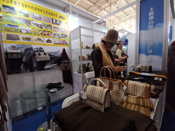 在农展馆内的展台上,来自玉树的牦牛肉、花蜜、手工艺品等吸引不少采购商。受访者供图