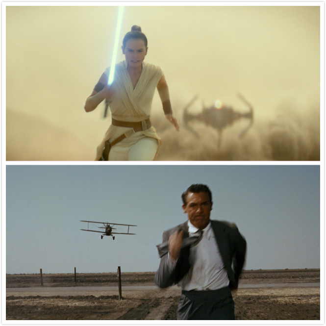 蕾伊在沙漠上与凯洛·伦对决前被飞行器攻击的一幕致敬了希区柯克影片《西北偏北》的经典镜头。
