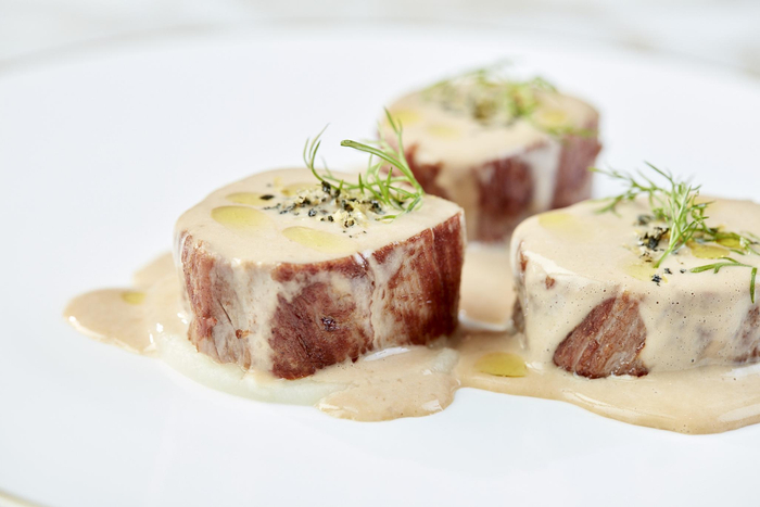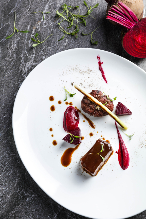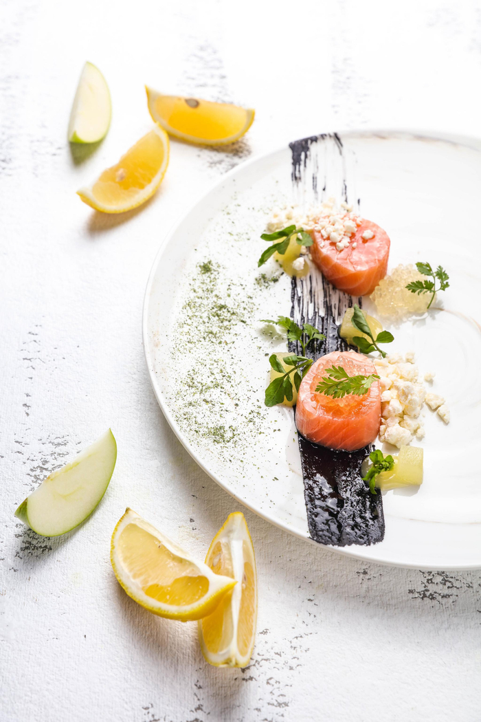 主厨Nathan Griffin来自英国,他热衷于探索当地特色以及应季食材,创作出别具风味的菜品。Nathan Griffin特别为食客推荐两道菜,一道是46℃低温料理昆布大西洋三文鱼卷,虽然是一道西餐菜肴,但倾注了主厨对于中式意境的理解。墨鱼汁既作为调味料,也在盘内勾勒出水墨意境。慢煮烹制的三文鱼,不仅保留原味而且健康,满口清新香甜。还有一道菜是和牛两吃,采用M6级澳洲和牛,搭配烟熏红菜头泥和焦烤香葱,为滑嫩多汁的牛肉增加焦香口味。