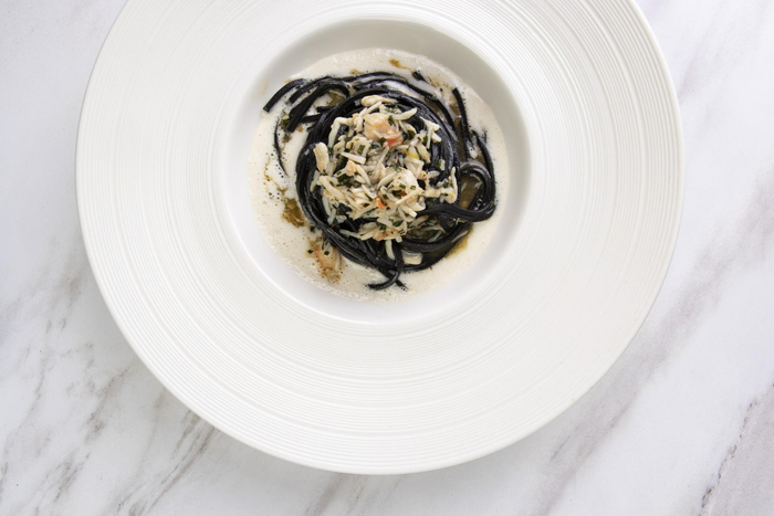另一道是经典的墨鱼汁面,选用阿拉斯加帝王蟹,搭配杏仁奶,再以柠檬皮调味,将海洋的鲜味带到嘴里,唇齿留香。