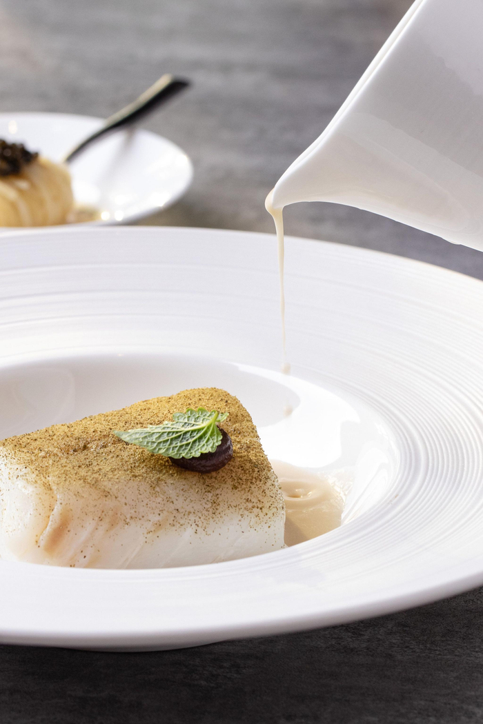 这个季节,Aniello推荐了两款必点菜。一道是大西洋黑鳕鱼,你能感受到微酸的发酵汁,中和了鳕鱼肥腻的口感,实现味觉的平衡。黑鳕鱼通过55℃低温慢煮,搭配土豆丝,淋上经过三次发酵的酱汁,最后点缀橄榄泥和鱼子酱,口感丰富。